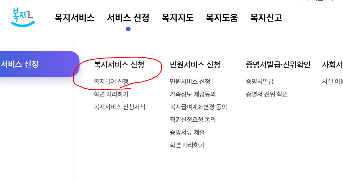 복지로 홈페이지에 들어가 복지서비스 신청을 클릭합니다.