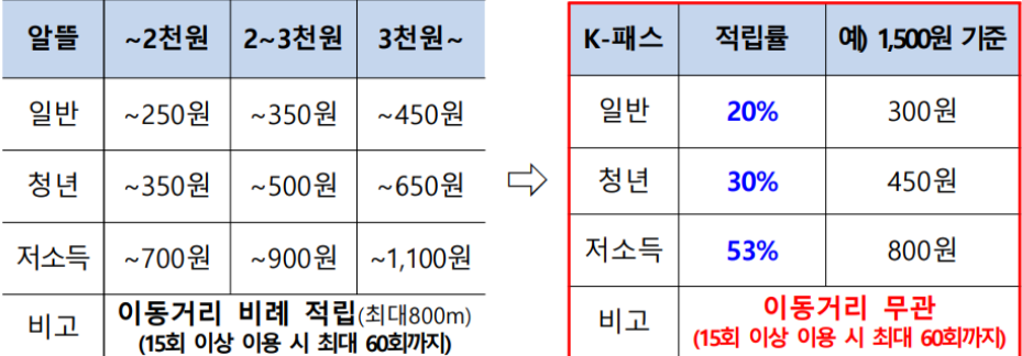 K 패스는 위에서 말씀드렸다시피 알뜰교통카드의 불편한 점을 개선한 것이라 좋아진 헤택들이 많습니다. 하나씩 알려드리도록 하겠습니다.