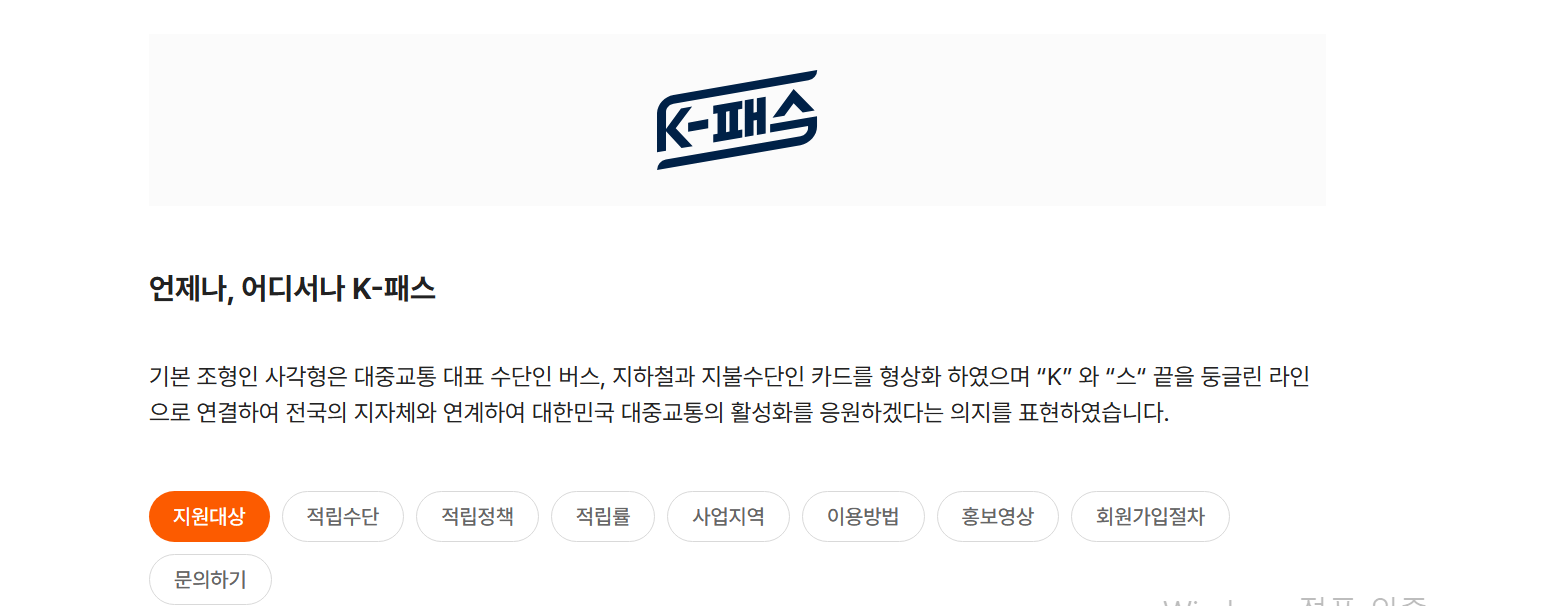 1. K 패스 홈페이지에 들어가시면 K 패스 전반적인 사업과 이용방법, 적립률, 적립수단, 지원대상, 회원가입 절차, 직접 궁금한 점들을 문의할 수 있는 페이지가 있으니 참고하시면 좋을 것 같습니다.